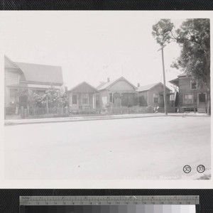 View of houses with fenced-in yards on Bauchet Street near Old Chinatown, Los Angeles.