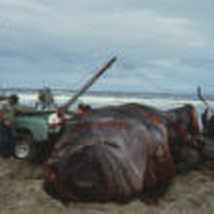 An autopsy of a whale which underwent a Norwegian flensing. Flensing is the stripping away of blubber and/or skin. Knives were used and the lower jaw was sawed off.