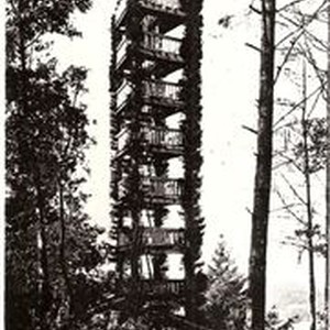 Photo--black and white: Living Tower made from four growing redwood trees, Camp Meeker, California. The tower was a recreation attraction for Camp Meeker / Russian River area in the 1900s.