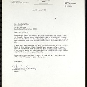 Charles Evers (Town of Fayette, Mississippi), Fayette, Mississippi, letter, 1974 April 16, to Arenia C. Mallory (Saints College), Lexington, Mississippi. [Description English/roman)]