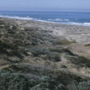 Panoramic view of the coastline at Morro Bay with sand dunes in the foreground.