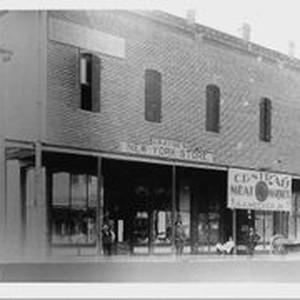 Photo--black and white: Stores on Main Street Sebastopol circa 1880s. Stores in two-story brick building include Pierce the Painter, Crayne's New York Store and Central Meat Market proprietor S. A. Meeker, Jr. Four men are in front of each store and a wagon is seen to the right. Four chimneys are visible. These stores were in the current (2009) location of the Sonoma County Repertory Theater and formerly Pease Drugs.