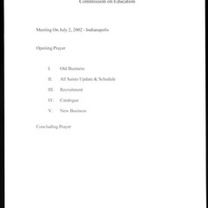 All Saints Bible College, Commission on Education, agenda, Indianapolis, Indiana, 2002 July 2. Includes handwritten notes. [Description English/roman)]