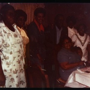 Two photographs of people at a social gathering. One photo shows several people (Davie Simmons standing, Andrea Mallory Clemmons standing, Marguerite Walton seated) near a table. One photo shows several people seated at a table (Andrea Mallory Clemmons center, and others). [Description English/roman)]