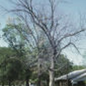 Neighborhood corner (8th and Bell) with three trees in different stages of disease.