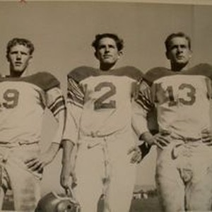 Photo--Black and white: Analy High School Tigers Football, 1953. Analy football players L-R Gary Kimes (9) Corky Abbott (2) and Gene Holloway (13). Photographed by Joe Price, Jr Press Democrat.