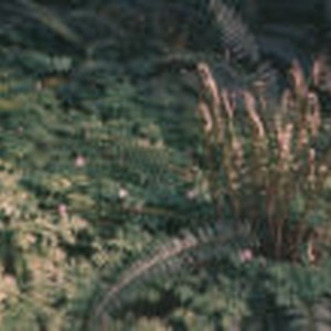 Pacific bleeding heart flowers peeking through a mesh of Western swordfern.