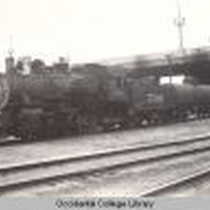 Photograph of Atchison, Topeka, & Santa Fe railroad train #590 heading north on tracks under what appears to be the First Street Bridge in Los Angeles (i.e., on the West side of the Los Angeles River). Appears to be an oiler freight train. A boxcar is visible in the background on another track. No caption or description given on photograph. Unpublished photographic print. Monochromatic photographic print with white border of approximately 4 mm on all sides.