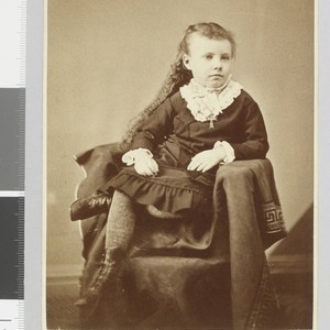 Cabinet card portrait of Charmian Kittredge London on her 7th birthday. Title and date transcribed from envelope. Verso of card reads: "to Auntie from Charmian on her 7th birthday, Christmas 1879" and "Duplicate" in handwriting. Verso of card is printed: "Ingersoll Photographer, Cor. Broadway and Twelfth Street, Oakland, CAL."