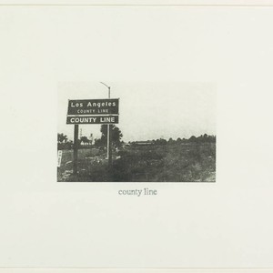 In the foreground of a grainy photograph stands a sign reading "Los Angeles County Line, County Line." In the background stand rows of indistinct trees, and the middle ground is is filled by an arid landscape.