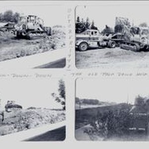 Photo, black and white: Old Palm Drive Hospital demolition October 1978. Eight photos on two sheets show large earth moving equipment and trucks after Old Palm Drive is razed.