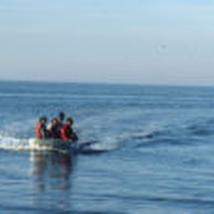 Four students returning to shore at Mecca Beach on the Salton Sea.