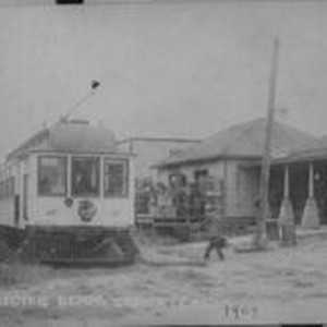 Photo--black and white: P&SR Electric railway depot in Graton, 1909. Train No. 67 is stopping for passengers.