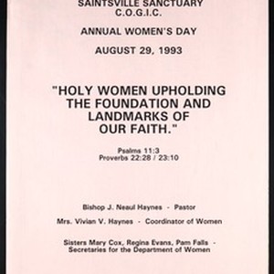 Annual Women's day program, "Holy women upholding the foundation and landmarks of our faith", Saintsville Sanctuary Church of God in Christ, Saintsville, Texas, 1993 August 29. [Description English/roman)]