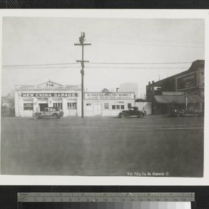 View of three business fronts on North Alameda Street, Los Angeles: New China Garage, Alameda Poultry Market, and a Chop Suey restaurant, with a sign for Autobank auto loans on building at right. Automobiles are parked in front of the businesses. Title transcribed from photograph.