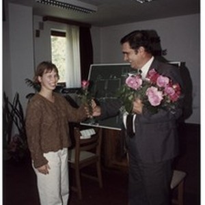 Photograph of Mihael Kuzmič giving a rose to a student after the end of a course. [Description English/roman)]