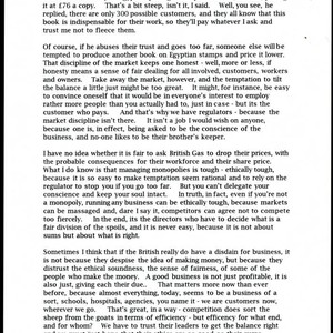 Charles Handy thought for the day on fair and ethical business practices in a competitive economy. Handy begins the thought discussing how he came across someone preparing a book for publication that would only attract a few hundred customers, but would guarantee a high return to the author due to its price point. He proceeds to talk about how the market prevents people from taking too much advantage of people's trust for a product by having regulators monitor selling and price points. Handy then reflects on the British reluctance toward business and concludes that it is really the lack of ethical soundness in some capitalists that Britons object to.