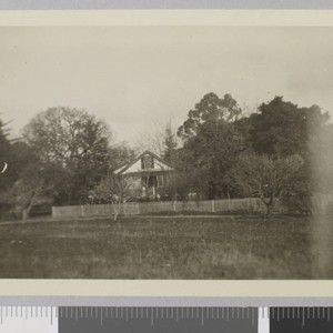 Front of cottage on Jack London Ranch behind trees with fence in front. Title and date transcribed from envelope. Verso of photo reads: "London Ranch."