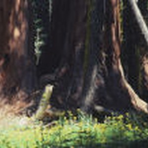 An image of a group of sequoias with a deer resting between them. Taken in the Crescent Meadow, a small sequoia rimmed meadow that is the western terminus of the High Sierra Trail.