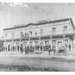 Photo--black and white: Gualala Hotel in town of Gualala, CA. circa 1903. A large number of men in suits line the porch of the hotel. Photo identified by Ralph Sturgeon as "Misc-13."