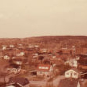 Homes and commercial buildings within Sudbury, with power plant in the background.