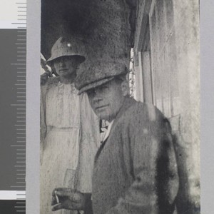 Romaine Fielding sitting in hat with cigarette and woman standing behind him. Title and date transcribed from envelope. Fielding was a film actor and director who made a movie version of Jack London's book The Iron Heel.