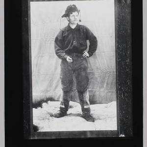 A full-length portrait of Jack London wearing heavy trousers and a button-down shirt and fur boots and a hat. His left hand is on his hip and his right hand is in front of him. Title supplied by cataloger, date suggested by cataloger based on London's time in the Klondike.