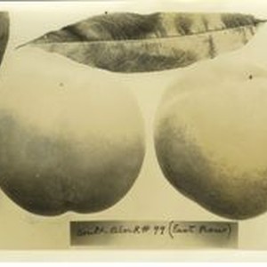 Photo, black and white: Two plums. Caption: "south block # 99, (east row)."