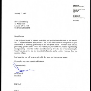 Correspondence to Charles Handy from Dean Hirsch congratulating Handy on being made a CBE. Hirsch states that it was a richly deserved recognition for Handy's contributions to humanity, particularly the non-profit sector. He proceeds to state that World Vision remains grateful to Handy for his advice and wisdom, and closes the letter with warm regards to Elizabeth Handy.