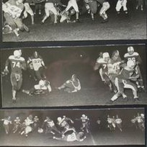 Photo--Black and white: Analy High School football game vs San Rafael at San Rafael, Friday night, October 14, 1949. Three photos of the game in play. The bottom photo has captured all eleven of the Analy "Tigers" players in the shot. Analy 27--San Rafael 6.