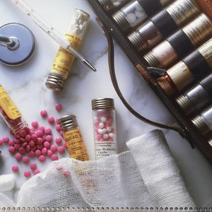 Scope/Content: December image titled Pharmacopia from a 1989 calendar titled Advances in Healthcare; items pictured are from the University of California, San Francisco Archives, Health Sciences Artifact Collection; calendar copyright 1988 Harwood Co.; medicine kit with bottles, drugs/pills, thermometer.