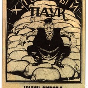 A poster agitating against well-to-do farmers and peasants in Soviet Russia. Captions read, "Khlebnyi pauk. Kulak-miroed. A mne kakoe delo do golodnykh? / Хлебный паук. Кулак-мироед. А мне какое дело до голодных?", meaning. "A spider. A kulak-bloodsucker. I don't care about the hungry". [Description English/roman)]