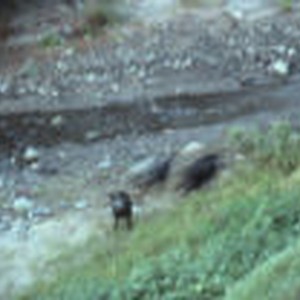 Feral pigs standing at the bottom of a grassy cliff on Christi Ranch.
