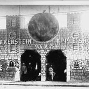 Photo--black and white: Gravenstein Apple Show front entrance on Main Street Sebastopol in 1912. The Apple Show was held August 19th through 25th. The entrance is made to look like a castle. Several people stand at the entrance and men are looking out the two ticket windows.