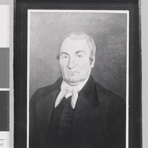 Photograph of framed painted portrait of Jacob Wiley Scott. Title and date transcribed from envelope. Identity of subject is unverified. Copy print of original. Wiley is the father of Ninetta Wiley Eames Payne.