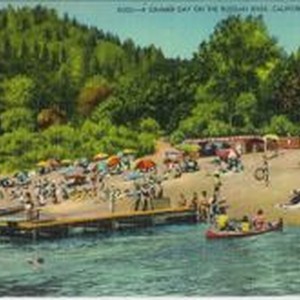 Postcard--photo--hand colored: The Russian River CA. Bathers and boaters and sunbathers on the beach with sun umbrellas. Caption: "G223:- A summer day on the Russian River, California." Circa 1930s