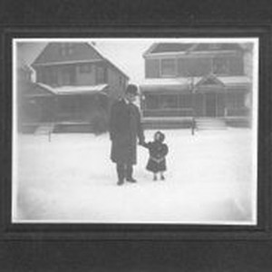Photo--black and white: Chester Myers with his granddaughter Cornelia Bunni Myers in Ravenna, Ohio around 1907 when Bunni was about 2 years old. Both are standing in the snow in front of two houses.