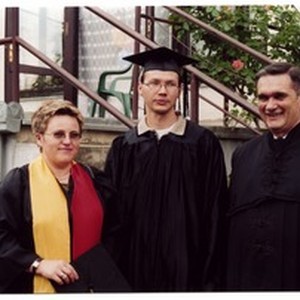 Fotografija Mihaela Kuzmiča s dvoje studenata nakon promocije u Osijeku na Evanđeoskom teološkom fakultetu. [Description (original non-English/roman language/script)] Photograph of Mihael Kuzmič with two students after the graduation ceremony in Osijek at Evangelical Theological Seminary. [Description English/roman)]
