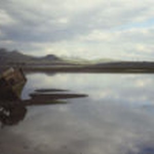 Mud flats with abandoned boat in foreground and mountains in background.
