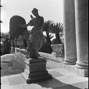 In the southwest corner of the loggia, with the south terrace in the background. Label accompanying photograph in album reads "HEH 3 "Diana," by René Frémin, terra cotta figure, dates 1717. On loggia, Huntington Art Gallery."