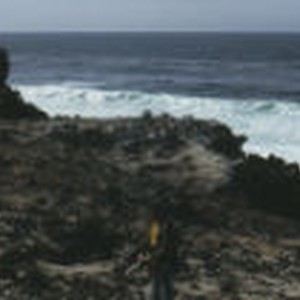 A man standing by a sea lion rookery located on a cliff on Isla San Martin.