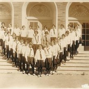 Photo, sepia: Analy High School Girl Reserves organization--part of a state-wide organization. The girls are standing in front of Analy High School gym. Photo taken for the 1927 yearbook 'the Azalea'. Girls in middy blouses and bloomers.