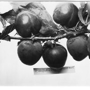 Photo--black and white: Tree branch with plums. Burbank "Elephant Heart" Plum. Labeled: "K-22 (Entire tree) "Elephant Heart." Circa 1928
