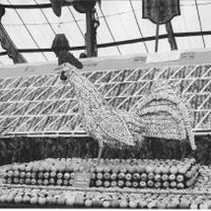 Gravenstein Apple Show display of a rooster made of sliced apples standing on a platform of whole apples sponsored by the Cunnigham District, about 1910