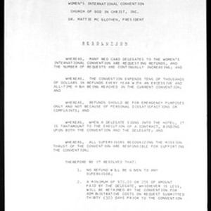 Women's International Convention, Church of God in Christ, meeting resolution, 1986 August 26, regarding red card deligates. [Description English/roman)]