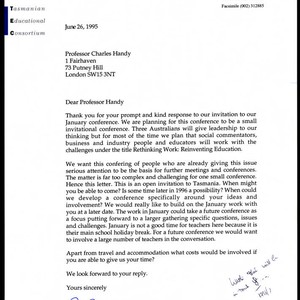 Letter of correspondence from Ruth Radford to Charles Handy inviting him to Tasmania. Radford begins the letter informing Handy about the basis and purpose of the Tasmanian Educational Consortium conference on rethinking education. She proceeds to state how TEC would like to build a session around Handy's ideas and involvement, and requests any cost estimate that Handy could provide for his journey.