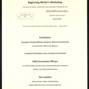 Auxiliaries in Mission (AIM) convention, Church of God in Christ (COGIC), writers workshop syllabus, Charlotte, North Carolina, 2010 July 2-6. [Description English/roman)]
