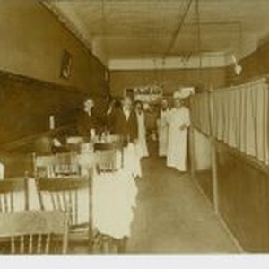 Postcard--photo--black and white: Interior of restaurant circa 1900. Curtained booths on right and open tables on left. Waiters and cooks to the rear.