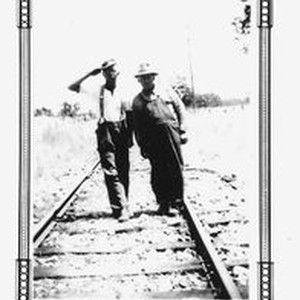 Photo--black and white: P&SR railway line crew in February,1937 at work on the tracks. Pictured: L-R: W. Jim Phillips and E. Yeager.