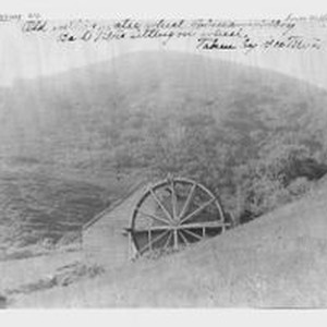 Photo--black and white: Old mill and water wheel on lower Willow Creek near Coleman Valley. Bert Titus sitting on atop wheel. Photo taken by George Titus.